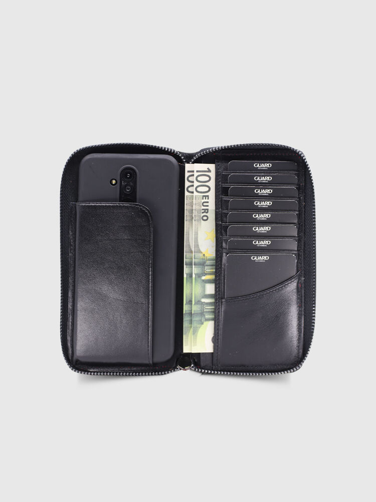 Fermuarlı ana bölüm içerisinde 1 adet telefon haznesi(tüm marka/model telefonlar sığmaktadır), 8 adet kart bölümü, 1 adet kağıt para ve 1 adet de cep bulunmaktadır.Ebat 10 x 17 x 2 (cm) Ağırlık 96gr. Dış Malzeme Piton Derisi Astar %100 Pamuk Aksesuar Çelik Garanti Süresi 24 ay