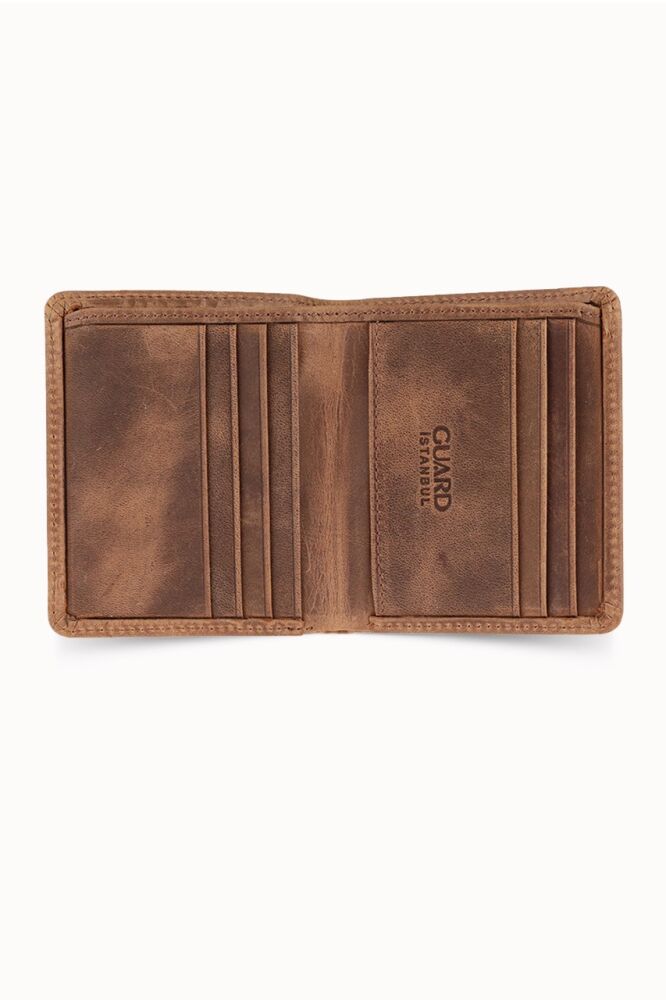 Our leather men's wallet model is 2 cm deep. In the main section, there are 9 card holders, 1 transparent ID / driver's license section, 2 hidden pockets and 2 paper money compartments.